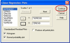Dan masukan *SDRESID pada Y dan *ZRESID pada X seperti dibawah ini,kemudian klik ”continu sehinnga tampilannya menjadi sebagai berikut : kemudian akan tampak tampilan semula lalu Klik ”ok” Sehingga secara otomatis lembar output dari pengolahan data menggunakan analisis regresi dengan spss 12.0 ini ditampilkan seperti dibawah ini..